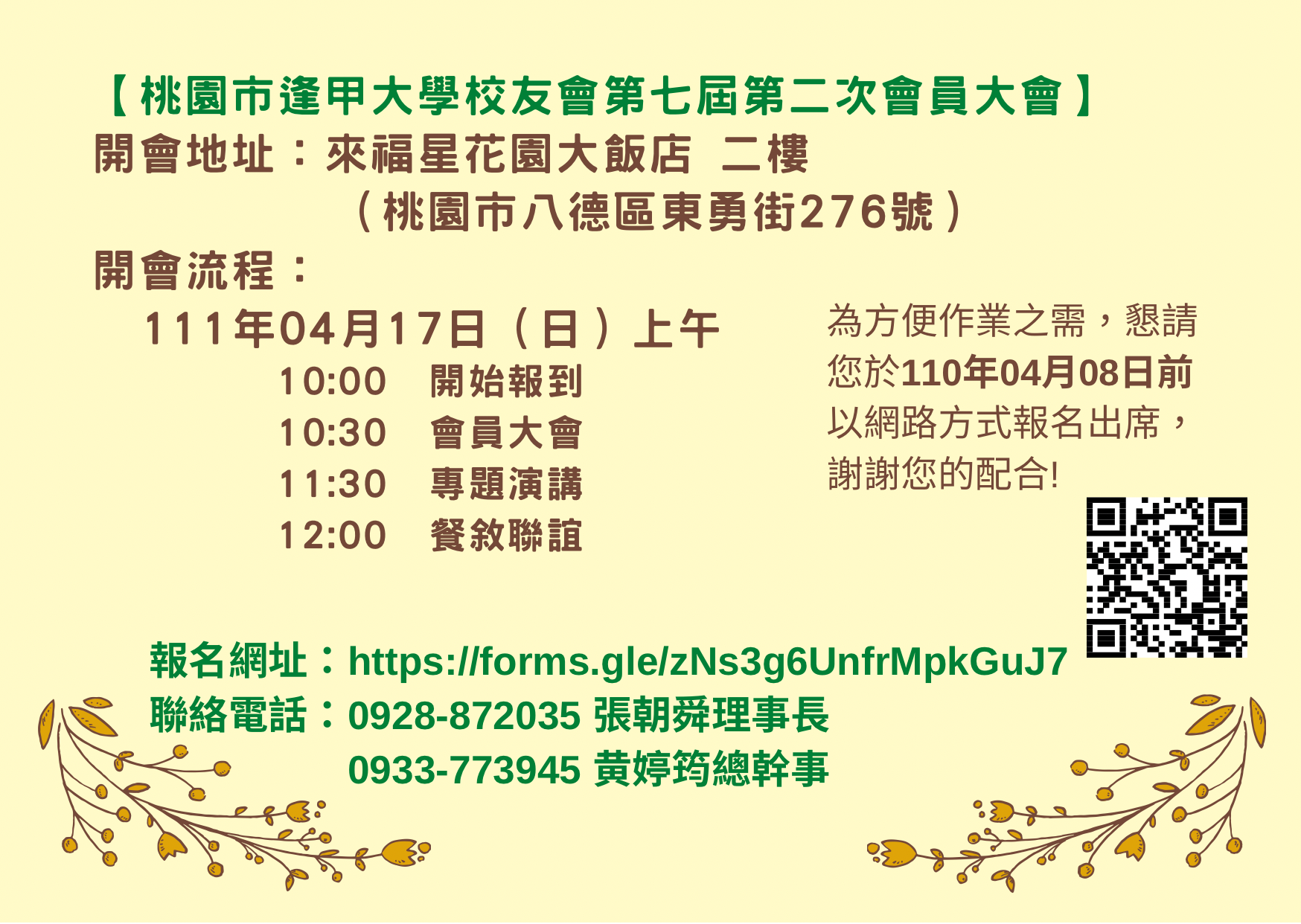 【2022/04/17桃園市逢甲大學校友會第七屆第二次會員大會報名網站,請儘速報名!】
