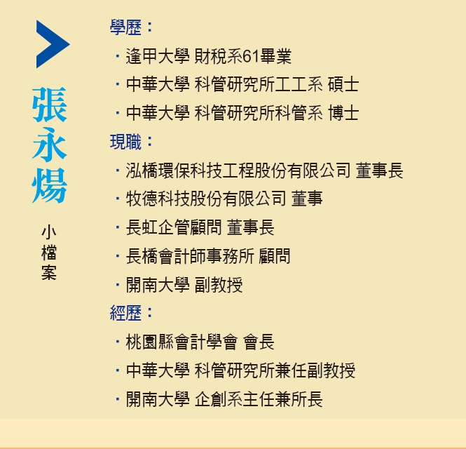 出生於桃園觀音鄉務農家庭的張永煬學長,從小父親就常鼓勵孩子參加國考考取公職,較能有穩定的求職機會,於是他大二便高普考及格,民國61年,逢甲大學財稅系畢業。先後任職於經濟部中小企業處、銀行、財政部稽核處等公家機關,從稽核處卸任後,才轉而投資創業;另外,他也投身在企業創新管理專業、財政稅務專家、上市公司牧德科技董事,曾任台酒公司監察人、開南大學副教授等,也陸續攻讀取得工業工程管理碩士、科館研究所博士學位。