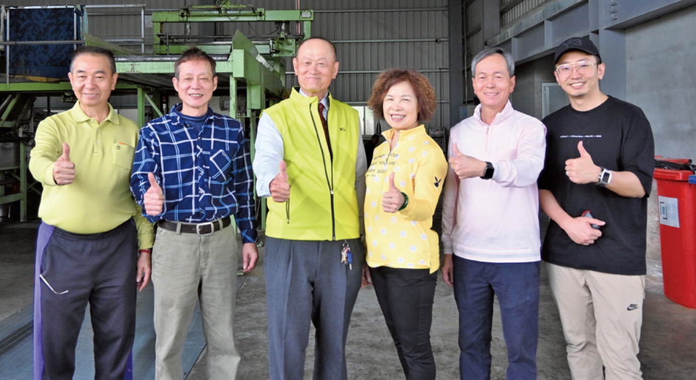 ▲張學長伉儷(左3、4)與張永輝營運長(左1)、王振邦廠長( 左2)、張永祺技術長(右2)以及張乃仁行政經理(右1)。