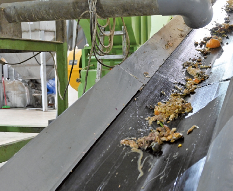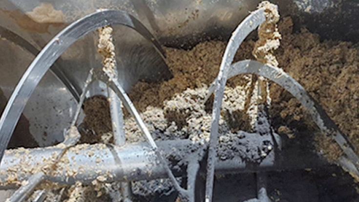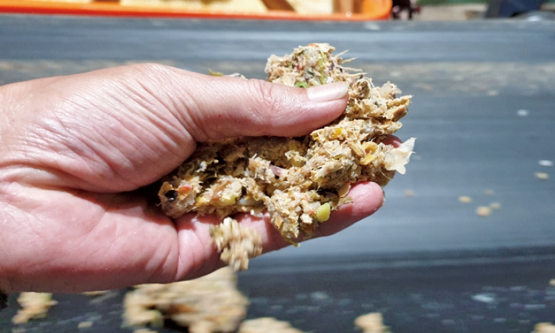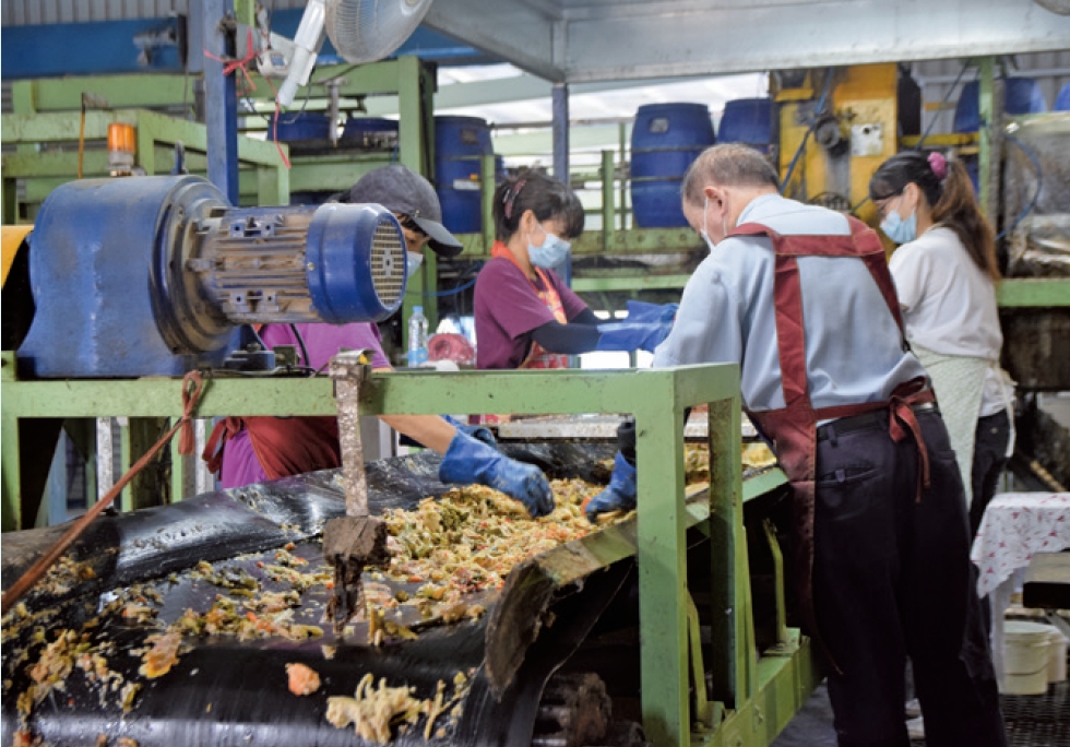 張學長帶領我們走進這個神奇的廚餘處理工廠,一探快速發酵的處理流程,如何將一桶又一桶的廚餘變成具有營養價值的有機肥。每天早上桃園市政府的資源回收車會載著來自各區的廚餘進廠,從進料開始,每個SOP都以效率為考量。首先堆高機將數桶廚餘送進專利自動翻桶機將廚餘倒進機器,單次處理僅需20秒,單日量可超過60公噸;廚餘須經過人工撿拾流程,去除誤丟入的人工垃圾,包括塑膠袋、湯匙、包裝等;接著將副資材混入以調整水分與碳氮比再進行粉碎,提高後續脫水效率。脫水過程將殘渣與液體分離,形成乾渣與營養液,營養液經篩選及酵素作用後可以直接提供給有畜牧場登記證、水汙染防治許可證的合作畜牧場直接運用,全程無廢水產生,畜牧場再依自行需求添加酒糟、豆餅等高溫烹煮,讓豬隻食用增強抵抗力與營養成分。
