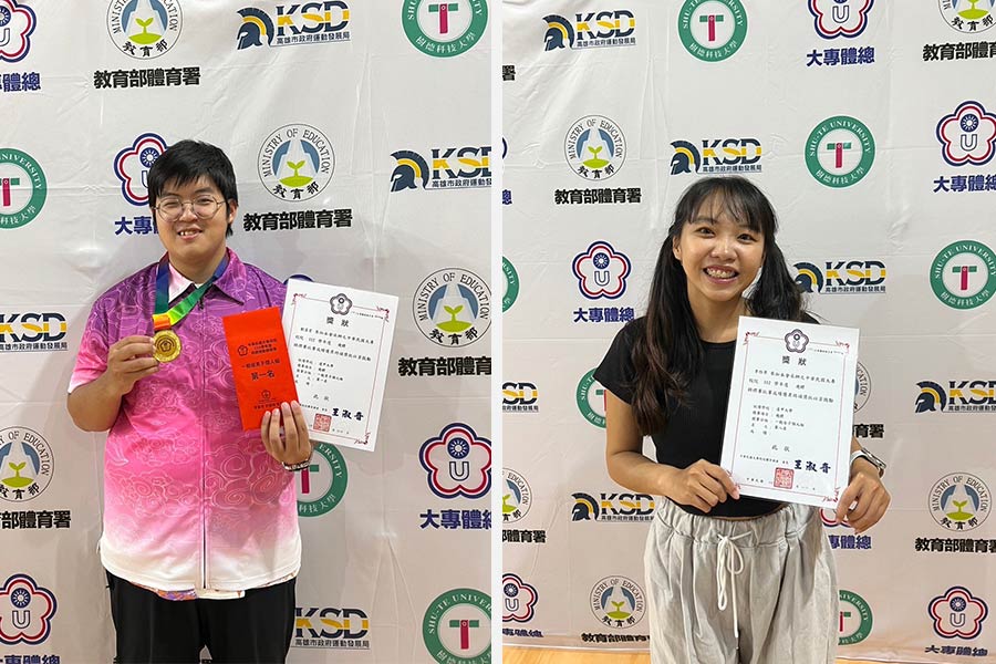會計三甲劉昱宏同學(左)第一次參賽就拿金牌;財金三乙李怡葶同學是飛鏢社參賽唯一女將,也獲得第八名的成績。